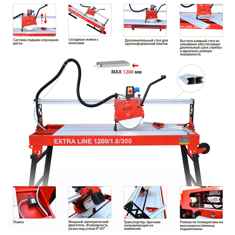 Плиткорез подходит для резки под углом от 0 до 45° всех видов натуральной и искусственной керамической облицовочной, напольной и тротуарной плитки. Новая конструкция направляющей и каретки на роликах из полиуретана снабженных высококачественными подшипниками обеспечивает мягкое перемещение режущей части и точный рез материала.При резке на большую глубину надо учитывать ограничения по мощности электродвигателя, чем больше глубина реза и чем тверже материал, тем меньше скорость резки. Сегментные диcки устанавливать запрещено!