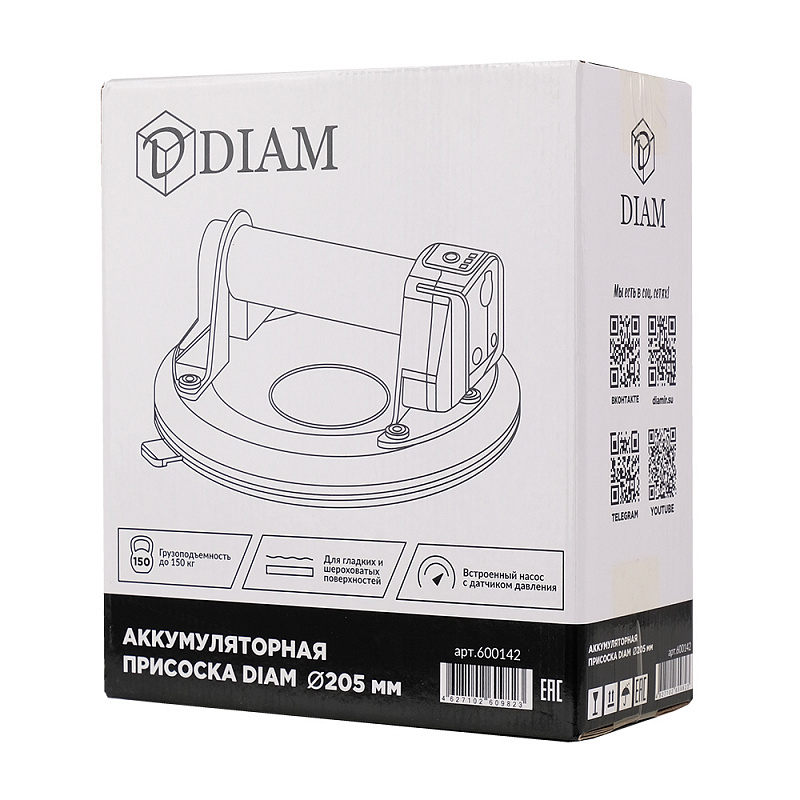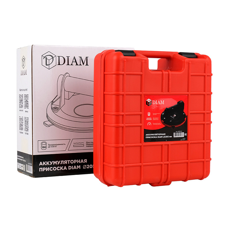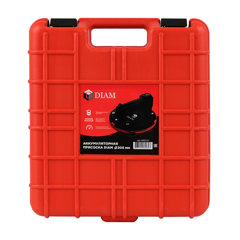 Присоска помповая аккумуляторная DIAM 205 мм предназначена для перемещения материала с гладкими поверхностями и небольшим рельефом, весом до 150 кг. Присоска не предназначена для подъема и перемещения материалов с «агрессивным рельефом». Состоит из прочного пластика, и прочной резиновой нескользящей мембраны. Оснащена встроенным электрическим насосом, датчиком давления и манометром давления для визуального контроля. Датчик давления анализирует силу разрежения воздуха и автоматически включает насос, когда требуется восстановить необходимые параметры вакуума (автоматическая подкачка). Провод для зарядки входит в комплект (блок зарядки в комплект не входит).